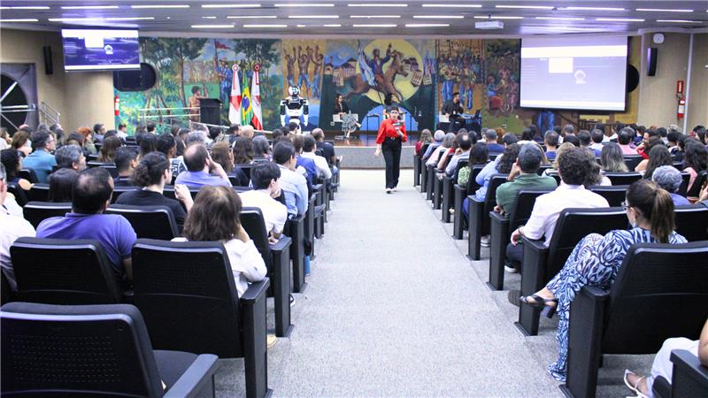 O evento. No palco, o robô Maximus. Foto: Ana Lima | MPC-MG